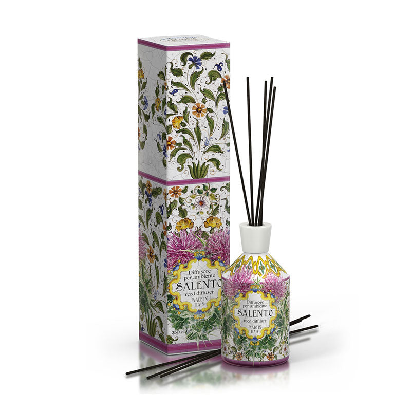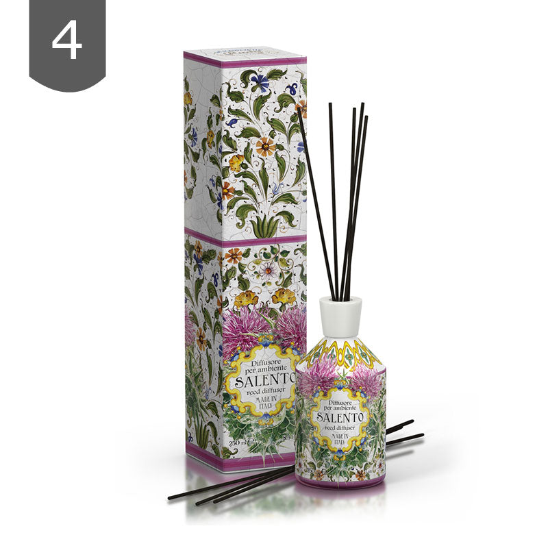 サレントへの旅は感性の旅。太陽、海の手つかずの自然と歴史が合わさった特別な体験ができます。プーリアの南で歴史あるオリーブの木やワイナリーと出会い、アドリア海、イオニア海で泳ぎ、黄金に輝く砂浜で寝そべったり、シロッコ風やトラモンタン風を感じることができるでしょう。レッチェのバロック調建築物は美術家が心奪われるほどです。街並みに育つワイルドフラワーたちをモチーフにした柄を施しました。