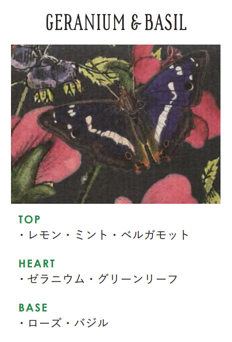 爽やかなレモン、ミント、ベルガモットの柑橘系にゼラニウムを加えたトップノートに、グリーンリーフの青さと、バジルを加えることにより、ローズの華やかさがいつまでも感じられる香り。